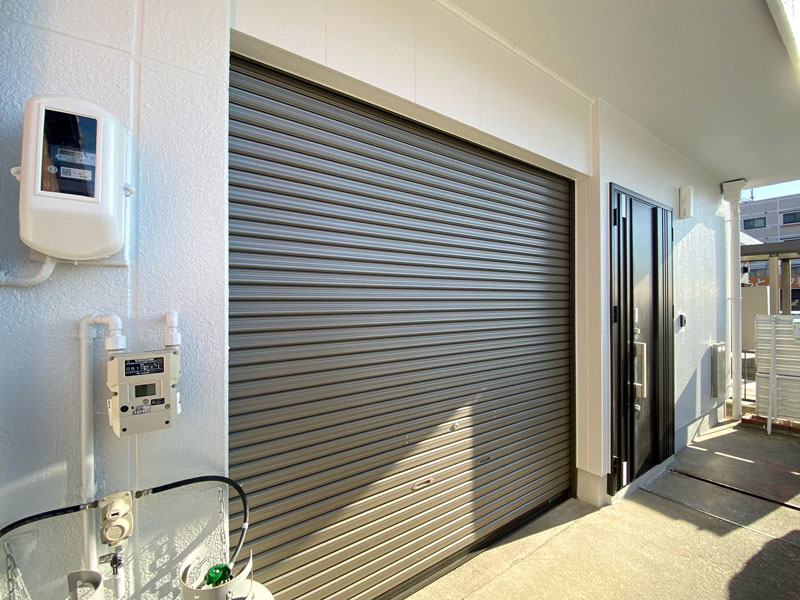 通り道程度の広さしかなかった玄関を解体し、使用頻度の低い倉庫片側のシャッターは撤去。広々とした玄関・玄関ホールになりました。